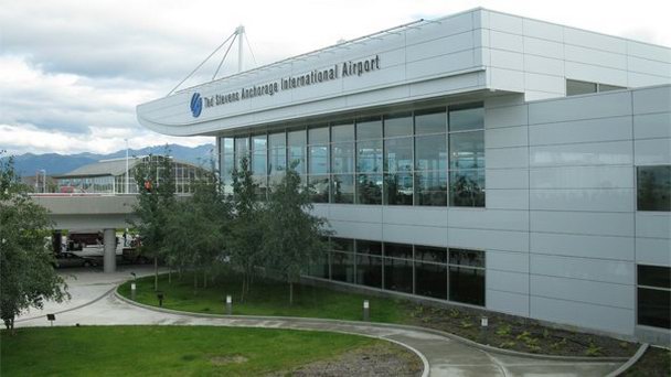 Международный аэропорт имени Теда Стивенса является главным аэропортом штата Аляска. Он расположен в шести километрах к юго-западу от Анкориджа. Аэропорт был открыт в 1951 году, нынешнее название получил в 2000 году, в честь бывшего сенатора США. Его площадь составляет 1300 гектаров. Здесь работают Северный и Южный терминалы и три взлетно-посадочные полосы с асфальтированным покрытием. Многие авиакомпании используют аэропорт Анкориджа как транзитный узел на рейсах в Азию.